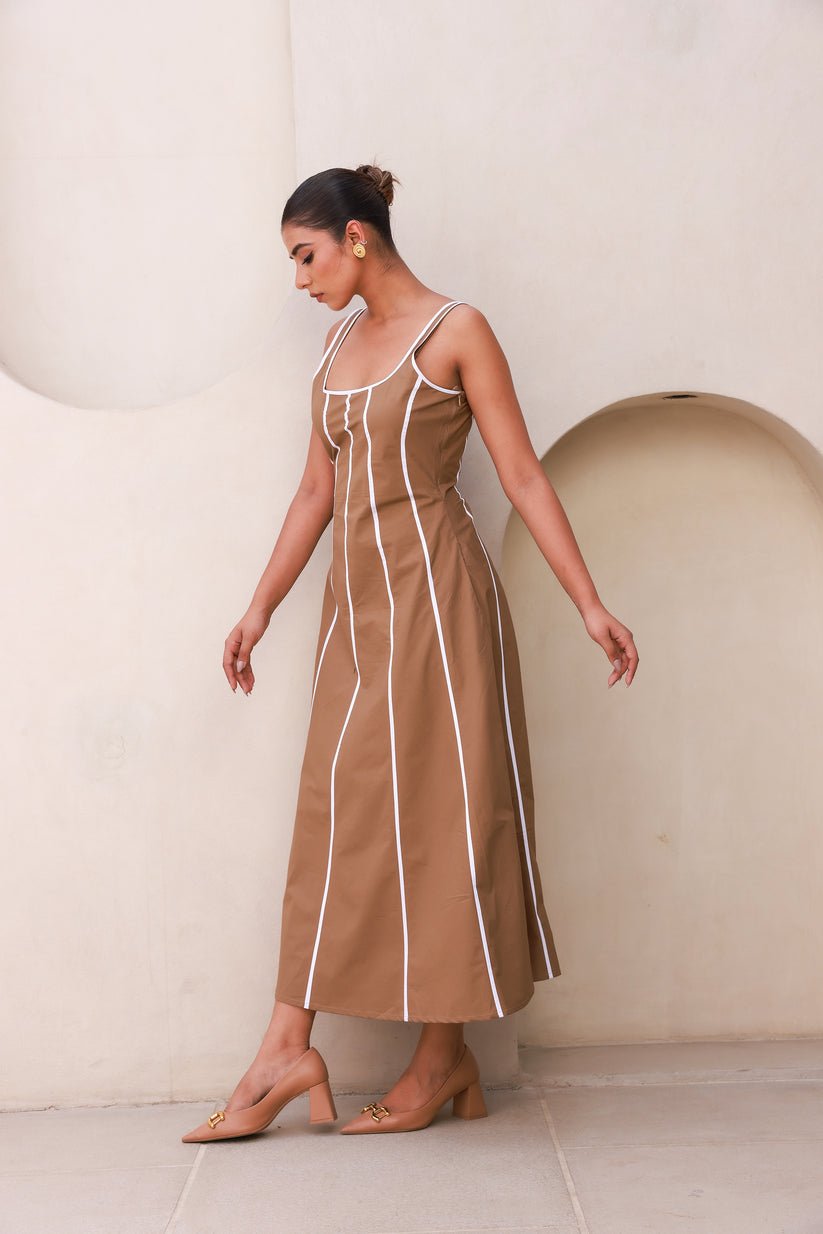 Beige Maxi Dress with Contrast White Piping